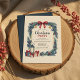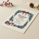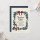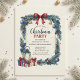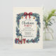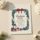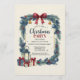 This charming Christmas party invitation features a hand-painted wreath border with evergreen branches, holly leaves, red berries, golden bells, and blue ornaments. A burgundy ribbon bow tops the design, while a vintage lantern and wrapped gifts add festive warmth. Perfect for holiday gatherings with a rustic, traditional aesthetic. Fully customizable for your event details.