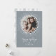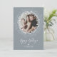 Holiday photo card featuring a rustic wreath of leaves and twigs on a silver-coloured background. Brush script calligraphy adds a classy touch.
