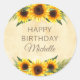 Rustic yellow and brown sunflowers with beautiful green leaves "Happy Birthday" custom stickers for women personalized with her name.