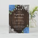 Invitations de mariage rustique bleu hydrangea inspirées des fleurs bleu hydrangea sur un arrière - plan rustique en bois et dentelle.