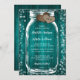 Faire-part de mariage turquoise rustique avec un bocal de maçon et des coeurs de burlap sur un arrière - plan en bois de grange.