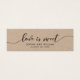 Cette mini carte kraft rustique avec les mots "l'amour est doux" dans le script de relax gris foncé fait une grande marque de faveur de mariage pour vous vos cadeaux de faveur de mariage doux et comestible. Il est facile de personnaliser ; il suffit de remplacer le texte de l'espace réservé pour ajouter vos propres informations. Pour plus d'options comme changer la police, la taille du texte ou l'espacement entre les lettres, cliquez sur le bouton "Personnaliser". *Veuillez noter que le filigrane Zazzle qui apparaît dans l'aperçu du zoom n'apparaîtra PAS sur le produit imprimé final. © Bois de rose et agrumes