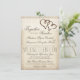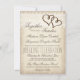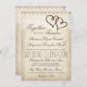 Typographie rustique unique de pays Mariage Invitations avec deux coeurs entrelacés dans le coin supérieur sur un dessin arrière - plan en papier ancien en détresse avec un dessin imprimé en dentelle blanche au sommet. La même conception à double coeur et papier vintage est également sur le côté arrière, sauf que les coeurs sont dans le coin inférieur. La police de caractères est une jolie combinaison de polices pour un style typographique. Ce qui est idéal pour le pays rustique et les mariages occidentaux. invitations de mariage rustique, invitations de mariage campagnard, invitations de mariage country western, invitations de mariage unique, antique, vintage, annonces de mariage de coeur, coeurs doubles, coeurs entrelacés, invitations de mariage de coeur vintage. invitations de mariage de dentelle vintage