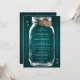 Faire-part de mariage turquoise rustique avec un bocal de maçon et des coeurs de burlap sur un arrière - plan en bois de grange.