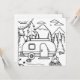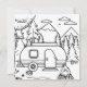 Cute colouring card with a with a camping theme. A campfire and and an RV camper camping in the woods.