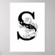 Elegant S letter monogram poster with flowers and lives. Black and white botanical illustration. Initial letter poster nurseries, bedrooms, part of home decor. Personalized gift idea.