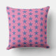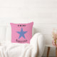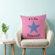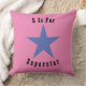 Make someone feel special with this throw pillow to put in their bedroom. A light blue five-pointed star with customizable text which says "S Is For Superstar" on a pink background. The reverse side of the throw pillow has a smaller star which has been made into a repeat pattern covering the whole area.