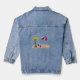 Attrapez cette veste en denim chic pour une promenade sur la plage. Plage de sable avec parasol coloré et quelques jouets de sable éparpillés.