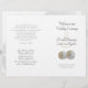 Modèle du programme de mariage plié avec des dollars de sable design. Le livre blanc est affiché, avec d'autres types de papier disponibles. Customisez le texte imprimé noir et calligraphie sur quatre pages - les deux côtés - de ce document. Plier après achat pour créer le programme. Le texte avant contient un titre, des noms avec une grande esperluette (et un signe), deux dollars de sable naturel et un endroit pour la date et l'emplacement du mariage. À l'intérieur, listez votre ordre de cérémonie et les participants à la fête de mariage sur un arrière - plan de deux gros dollars de sable blanc. Au verso du programme, un verset et une note aux invités peuvent être ajoutés. Exemple d'écriture : "L'amour est patient. L'amour est gentil" de 1 Corinthiens.
