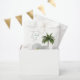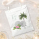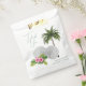 Sacs de mariage blanc avec dollars de sable tropical, palmier et fleurs design. Les hibiscus roses et les grands feuilles sont répartis sur deux dollars de sable blanc dans ce design. Un grand palmier est derrière le dollar de sable. "Merci" en vert en haut et noms avec date en bas. A utiliser pour les douches, ou les réceptions. Les sacs sont en série de 50, en papier blanc ou Kraft.