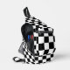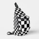 Le élégant sac à fronde est doté d'un motif à damiers noir et blanc audacieux. Pour voir d'autres objets À damiers noirs et blancs, cliquez sur le lien "Rocklawn Arts".