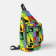 Êtes-vous un fan de Gem State ? Ce sac à fronde a un motif pop art avec l'état américain de l'Idaho en bleu, noir, violet, rouge, vert et jaune.