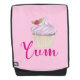 Un sac à dos conçu avec l'illustration d'un cupcake délicieux avec des tourbillons roses et une baie avec des feuilles nichés dans le gel. "Yum" écrit en rose chaud avec une police tendance fantaisie. Placez-vous sur un arrière - plan rose pâle.