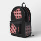 Two-tone black and pink. Pink checkered appliqués on a black backpack. Add your name to the front and your text to the right and along the zipper. Alternatively, you can change the appliqué designs to your own images or pattern.