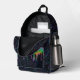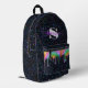 Ce sac à dos imprimé personnalisé dispose d'un arrière - plan de parties scintillant arc-en-ciel en réglisse noire, avec parties scintillant en cravate arc-en-ciel qui coule de la poche zip avant, Le modèle permet une personnalisation facile, y compris un gros monogramme initial et / ou un nom complet dans une police de calligraphie violet de néon. Les deux peuvent être facilement éliminés en laissant simplement la zone de texte personnalisée vide.