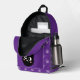 Drôle sac à dos violet avec une bande dessinée de chat noir avec de grands yeux ronds et des joues roses dans un style art dessin de doodle. L'arrière - plan est couvert d'un petit motif empreinte de patte.