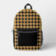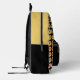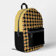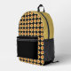 Voyagez avec ce sac à dos design et tendance qui présente l'image d'une fleur jaune Dahlia fleurie sur un arrière - plan noir et imprimé dans un motif carrelé sur le côté avant seulement. Un design floral et amusant ! Le dessus du sac à dos est une couleur jaune uni et assortie. Les côtés, le dos et la poche zippée sont noirs.