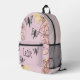 Sur ce sac à dos élégant se trouvent de belles fées entre une bannière à motifs floraux créant des vibes fantaisistes magiques sur fond de mauve rose. Peut être personnalisé sur la poche avant avec un nom pour le rendre unique.