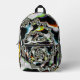 Ce sac à dos présente un art fractal en spirale psychédélique abstrait et coloré en noir et blanc avec des accents jaunes, orange, bleus et verts.