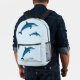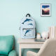 Adorable, doux, genre neutre sac à dos bleu clair avec trois dauphins bleus jouants. Le texte peut être personnalisé ou supprimé. Parfait pour les amateurs de dauphins pour les activités scolaires ou sportives.