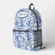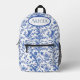 Des oiseaux fantaisistes volent parmi les branches fleuries d'une toile de jouy bleue sur ce beau sac à dos.