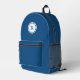 Le sac à dos bleu est muni d'un monogramme bleu gras en cercle blanc avec une bordure bleue étroite et un mince anneau blanc extérieur. Ajoutez votre initiale dans la barre latérale.
