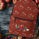 Back to school backpack, in barn red, with farm tractors design. Add the child's name to the front zippered pocket, in tan, printed font, above a single tractor image. The red tractor design includes some fun, farm animals and a dog, and is patterned over the front and sides. Tractor tire marks, in black, go across the zipper section at the top. A cute design for boys or girls.