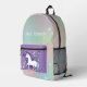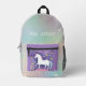 Un sac à dos pour cela entre le temps où on est assez grand pour un gros sac à dos, mais toujours fantaisiste dans la pensée. Ce design a une licorne blanche stepping sur la poche violette couleur avec étoiles. La surface est un ciel dégradé pastel avec des étoiles blanches, et le fond est une couleur rose plus foncé complétant le rose sur le fond de la poche de licorne. Personnalisez comme vous le souhaitez. Ce sont de très bons sacs, et il est bon d'avoir une pièce d'identité imprimée, je pense. Mais je mets les noms de famille des enfants sur les vêtements de dessus. Vous pouvez demander à votre enfant de répondre à son prénom uniquement pour empêcher des étrangers de l'appeler par son prénom.