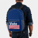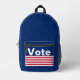 Ce sac à dos bleu foncé a Vote en lettres blanches sur la poche. Des rayures rouges et blanches traversent la poche et sous le texte.