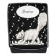 Ce sac à dos pour adultes Bold Face avec une face avant interchangeable a un chat blanc riant avec une grande queue moelleuse marchant à travers les touches de piano noir et blanc sur un arrière - plan noir avec des notes musicales blanches. Customisez votre nom dans l'ovale blanc avec le modèle.