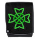 Ce sac à dos Bold Face avec une face avant interchangeable a une grande conception de noeud irlandais celtique vert éclatant et en boucle sur un arrière - plan noir.