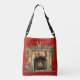 Sac fourre-tout avec une illustration chaleureuse et cosy avec une cheminée à l'ancienne. Embrassage suspendu avec soin. Garland suspendu au-dessus du manteau. Un feu chaud rugissant dans le foyer.