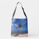 Le paysage marin aux couleurs vives sur ce Sac fourre-tout carrossable est une photo originale de ZoeSPEAK d'une plage à Key West, en Floride. Le ciel est bleu foncé avec des nuages blancs bouffants. Le soleil brille sur le sable jaune chaud et une jetée s'étend à l'horizon des eaux bleues de l'océan. Au bord de l'eau, un cocotier solitaire offre peu d'ombre aux adeptes de la plage.