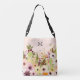 Un sac de carrosserie fleuri avec une toile ornée de fleurs de pavot enchanteresses et de roses délicats, dressé contre un arrière - plan rose doux et personnalisé avec un monogramme. Combinez votre jean et votre tee-shirt favori pour un look quotidien chic et sans effort.