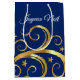 Ce sac cadeau de grande taille est présenté dans un tourbillon fantaisiste de couleur dorée avec le texte Joyeux Noël sur le devant. Montré en bleu saphir et or. Texte au sommet de Joyeux Noel. Customisez ce sac ou achetez comme indiqué.