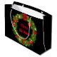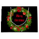 Le sac cadeau en papier est affiché en noir avec une impression festive de couronnes. Grande taille affichée. Customisez ce sac cadeau ou achetez tel quel.