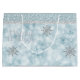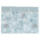 Magnifique sac cadeau de Noël bleu et argent glittery. Les graphiques d'un arrière - plan bleu aquamarine joliment brillant avec des flocons de neige bleus et des flocons de parties scintillant argentée ressemblant à des flocons de neige décorent les deux côtés du sac, avec le texte graphique argenté lisant Happy Holidays. Une bordure en parties scintillant graphique bleu et argent orne le haut du sac. Customisez d'ajouter tout texte supplémentaire à cet élégant sac cadeau de vacances. Le papier de tissu correspondant est disponible.