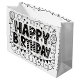Un sac-cadeau blanc avec des lettres noires qui indiquent "Joyeux Anniversaire" et divers gribouillages noirs. Le sac est fait de papier brillant et possède des poignées en corde blanche. Les lettres sont grasses et stylisées, chaque lettre étant remplie de motifs différents tels que des étoiles, des points et des rayures. Les gribouillages comprennent des ballons, des étoiles, des cercles et des lignes ondulées, créant un design festif et célébratoire. Le sac est bien éclairé, mettant en évidence le contraste entre le fond blanc et les graphiques noirs.