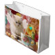 Un Kitty sucré et un bel oiseau perruque vert Le Kitty adore une crème latte