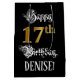 Ce giftbag design opulent et orné sur le thème de l'anniversaire comporte le message "Joyeux 17e anniversaire", ainsi qu'un nom de destinataire personnalisé. Une partie du message est dans un texte élégant de style script. Le grand numéro "17th" présente un motif de look imitation or. L'arrière - plan est noir de couleur. Un sac cadeau élaboré comme celui-ci peut être utilisé pour donner un cadeau ou un cadeau en l’honneur du 17e anniversaire de quelqu’un. [~Z0000560]