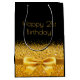 Sac cadeau de fête élégant, classique, glamour et féminin pour une femme de 21 ans. Un ruban et un arc de couleur or. Arrière - plan noir. Texte d'or : Joyeux 21ème anniversaire !