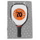 Joyeux 70ème anniversaire tex sur le pickleball orange et pagayer sur le pois gris et motif blanc. L'âge peut être changé.