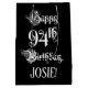 Ce sac cadeau d'anniversaire opulent et orné est doté du message "Joyeux 94e anniversaire", en texte de style script, sur un arrière - plan de couleur noire. Il a également un nom de destinataire personnalisé. Un sac-cadeau à thème d'anniversaire comme celui-ci pourrait être une façon respectable d'envelopper un cadeau ou un cadeau qui est donné à quelqu'un qui célèbre son 94e anniversaire. [~Z0000557]
