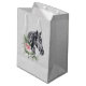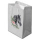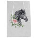 Un sac cadeau d'anniversaire avec une belle illustration d'une tête de cheval noire avec un embellissement floral fantaisie par son cou. Peinture animale élégante et classe. Arrière - plan tacheté gris.