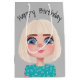 Jolie fille de dessin animé avec des cheveux blonds et de grands yeux sur un arrière - plan gris et Happy Birthday texte. Le texte est modifiable ou peut être supprimé. La couleur Arrière - plan peut être modifiée.