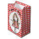 Baguette fille aux cheveux blonds, baskets, robe en vichy, collier de perle sur un motif en vichy rouge et blanc. Le texte de Joyeux Anniversaire peut être modifié.
