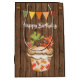 Ce sac cadeau d'anniversaire d'automne heureux comporte un cupcake mignon décoré d'un citrouille de bonbons, de glands et de feuilles colorés. Il y a aussi une bannière de bunting avec des glands et un faux arrière - plan en bois.
