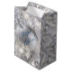Sac cadeau de Noël élégant avec bauble de Noël argenté, lumières brillantes blanches, mousseux et espace pour votre texte. Si vous avez besoin d'aide pour ce design, n'hésitez pas à me contacter.