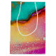 Sac cadeau avec un design artistique abstrait fantaisiste. Peinture aquarelle avec les couleurs mélangeant et mélangeant créant un motif marbré fluide.
