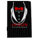 Illustration élégante de tuxedo blanc, cravate rouge avec nom de toiletteur personnalisable. Arrière - plan rayures noir et gris.